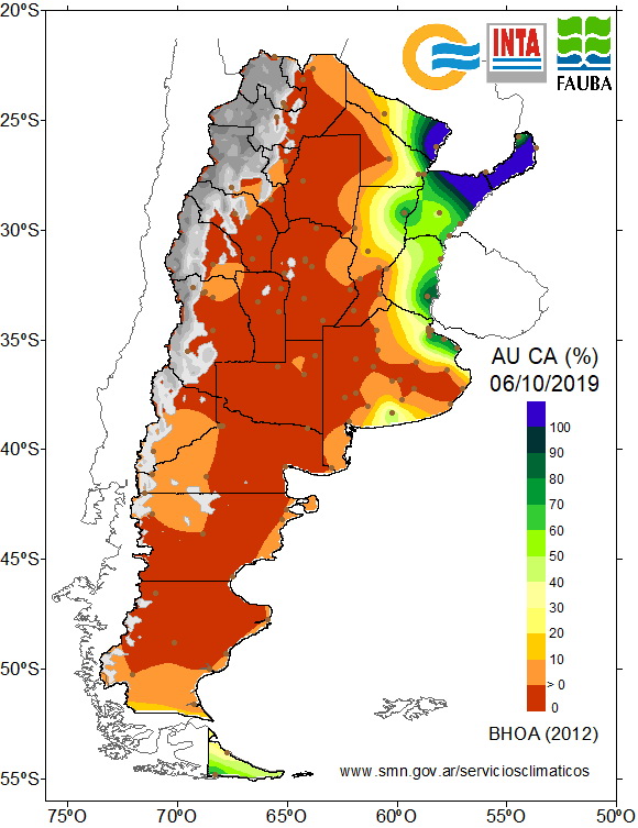 Siguiendo con esta tendencia, el pronóstico elaborado en el ámbito del Servicio Meteorológico Nacional por entidades oficiales entre las que se encuentra la Cátedra de Climatología y Fenología Agrícolas de la FAUBA (www.smn.gob.ar/pronostico-trimestral), indica que para el trimestre octubre-noviembre-diciembre se espera mayor probabilidad de precipitaciones normales o inferiores a las normales sobre La Pampa y oeste de Buenos Aires y temperaturas superiores a las normales sobre todo el centro del país, el NOA y el norte del Litoral.