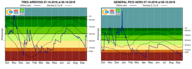 Por el contrario, en la figura 4 se puede observar que ya a partir de mediados de agosto se comenzaba a registrar déficit hídrico en General Pico, que actualmente se encuentra en el límite del punto de marchitez permanente. Las precipitaciones de septiembre presentaron una anomalía negativa que llegó al 75%, debido a que las lluvias acumuladas durante mes fueron de sólo 13 mm, en comparación con un promedio histórico de 53 mm.