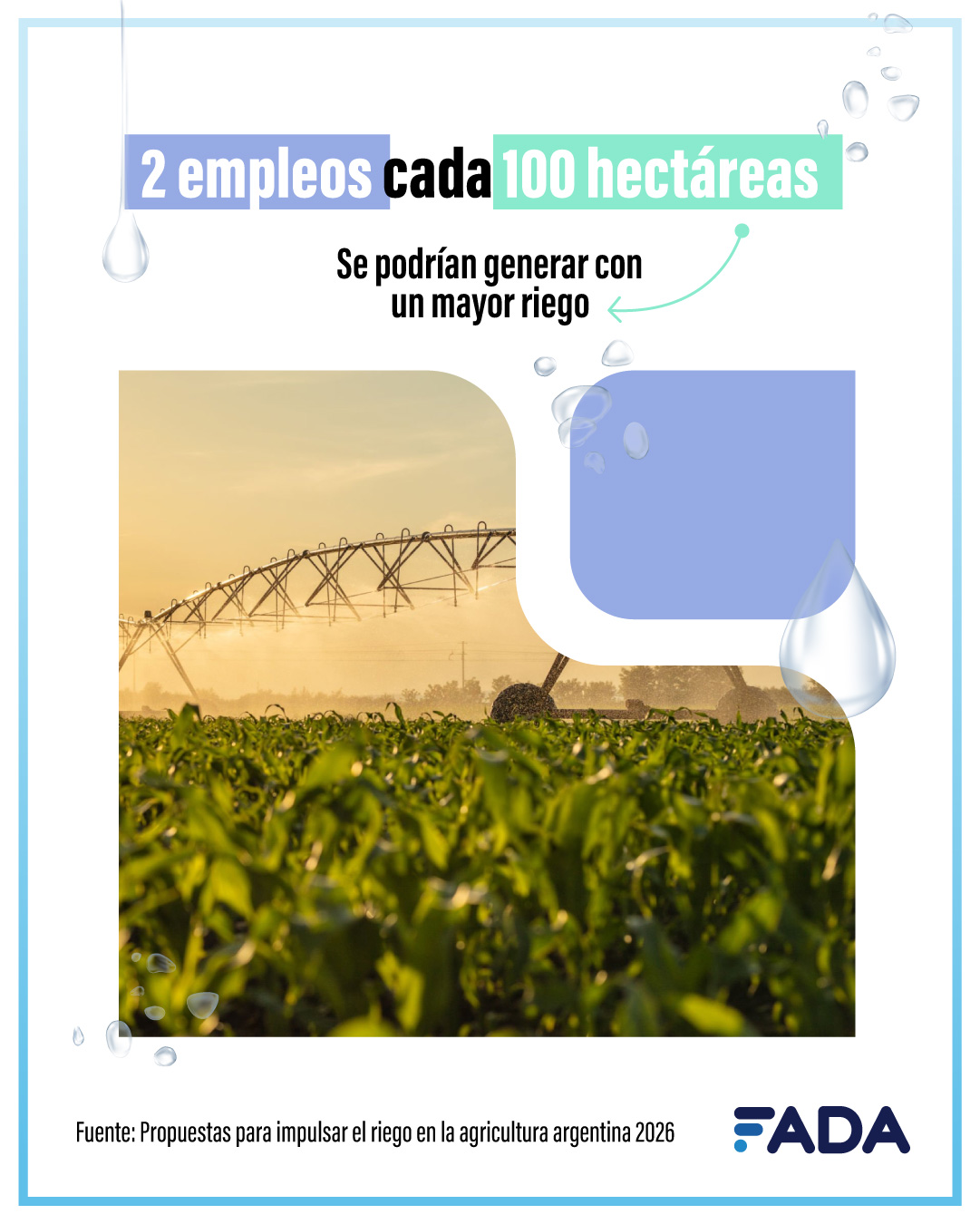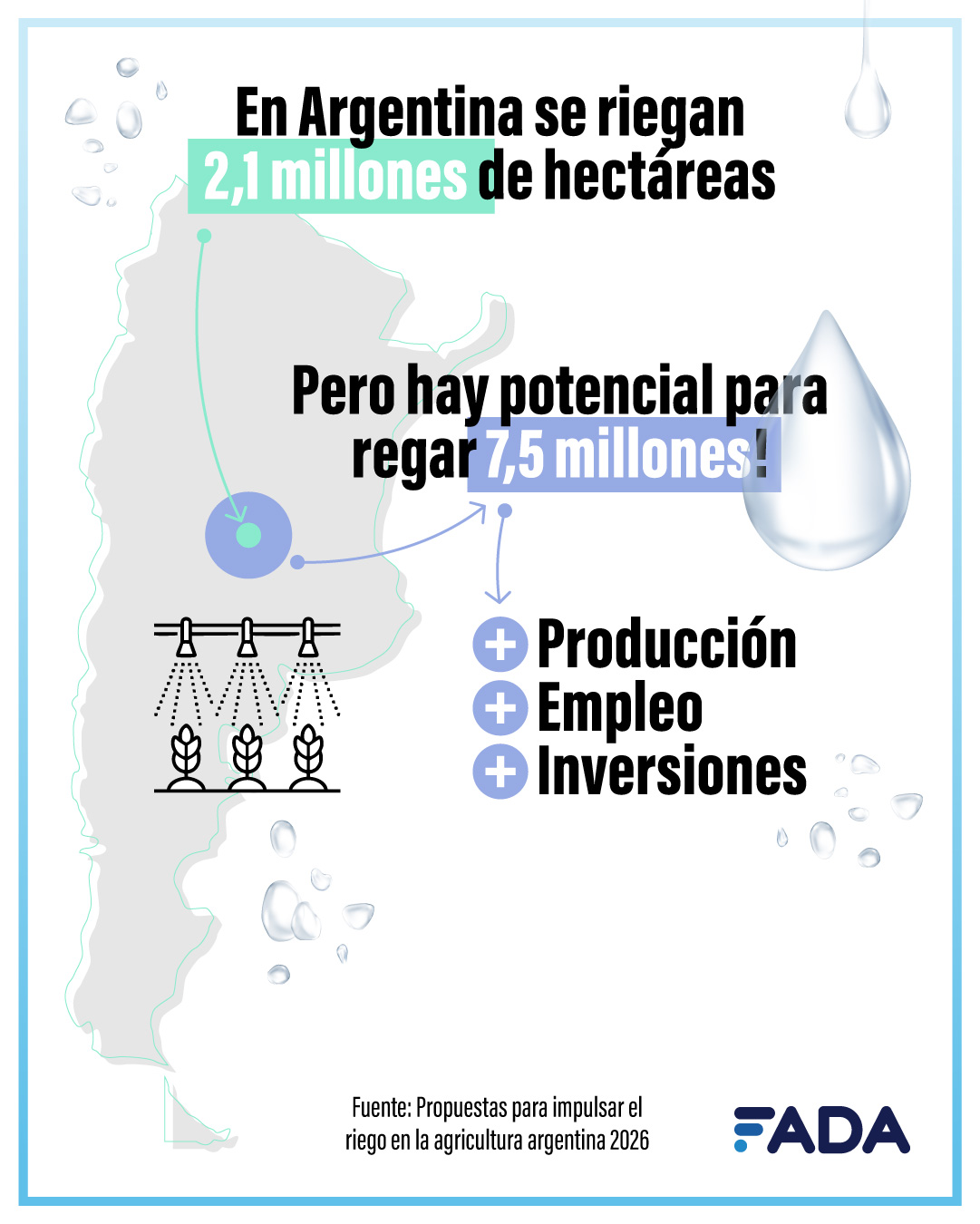 El mundo demanda cada vez más alimentos y producir enfrentando las constantes sequías es un gran desafío. En Argentina se riegan 2,1 millones de hectáreas, pero hay potencial para regar 7 millones y medio. Un estudio de FADA (Fundación Agropecuaria para el Desarrollo de Argentina) encontró un potencial oculto en la ampliación y mejoramiento del riego. En el informe se trabajaron propuestas que revelaron al riego como un generador de más empleo, más producción y un aliado de la sustentabilidad.