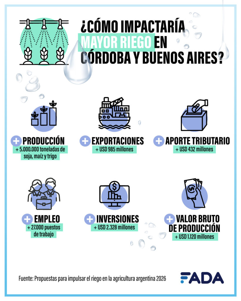 Sólo en Córdoba y Buenos Aires, ampliar el riego generaría más de un millón de toneladas extras de soja, más de 3 millones de maíz y más de 800 mil de trigo, es decir, podrían producirse 5 millones de toneladas más de estos granos. Llevado al empleo, generaría 2 empleos cada 100 hectáreas, aportando más de 27 mil puestos de trabajo: en servicios, industrias, fletes, para las exportaciones, entre muchos otros. “En ciertas zonas de Argentina, el riego no sólo mejora los rindes, o sea, lo que podés producir por hectárea, sino que marca la diferencia entre poder o no sembrar”, resaltan desde FADA.