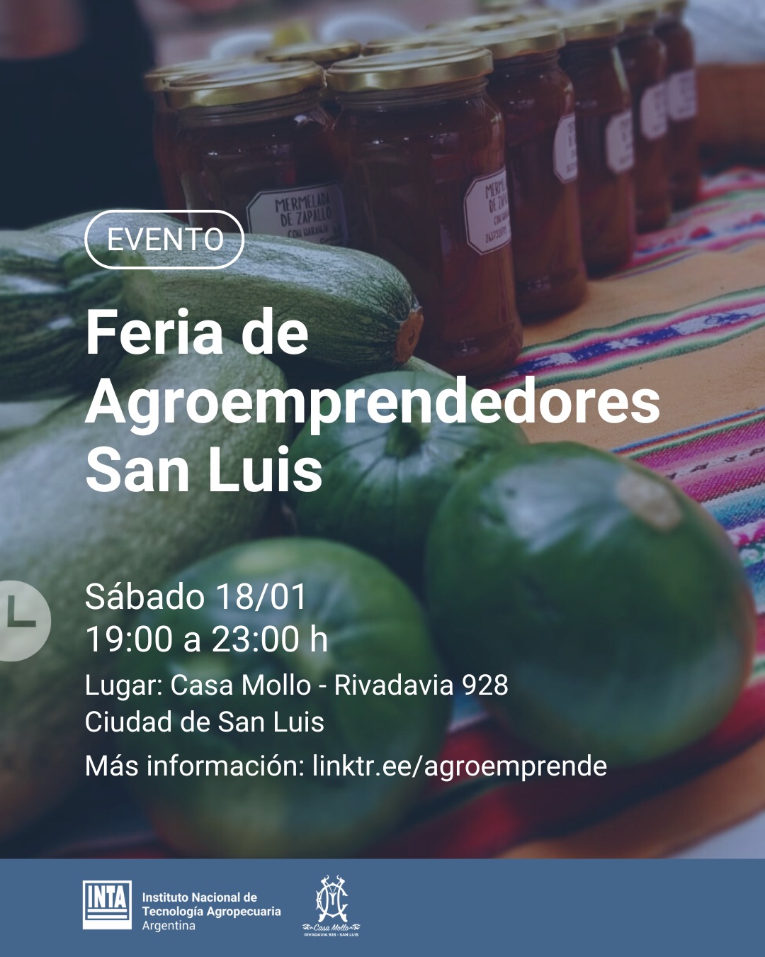 La Agencia de Extensión Rural (AER) del INTA San Luis realizará el sábado 18 de enero próximo una feria con productores y artesanos que se encuentran participando de diversas iniciativas de apoyo a los agroemprendimientos de toda la provincia.