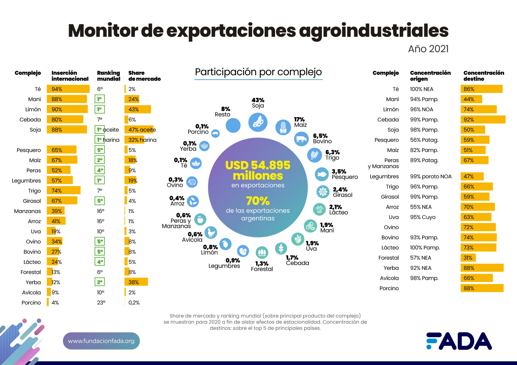 El Monitor de Exportaciones Agroindustriales, es un nuevo estudio semestral de FADA (Fundación Agropecuaria para el Desarrollo de Argentina). Una herramienta innovadora que explora el potencial de los complejos agroindustriales exportadores, derribando algunos mitos. Es un resumen de los principales datos, aportes y potencial de las exportaciones del campo. Mide la participación de las exportaciones agro en el total de las exportaciones del país y hace foco en 20 cadenas agroindustriales. Sobre estas cadenas se analizan indicadores de aporte de divisas, derechos de exportación, inserción internacional, ranking a nivel mundial, share de mercado, concentración de destinos y concentración de origen regional.