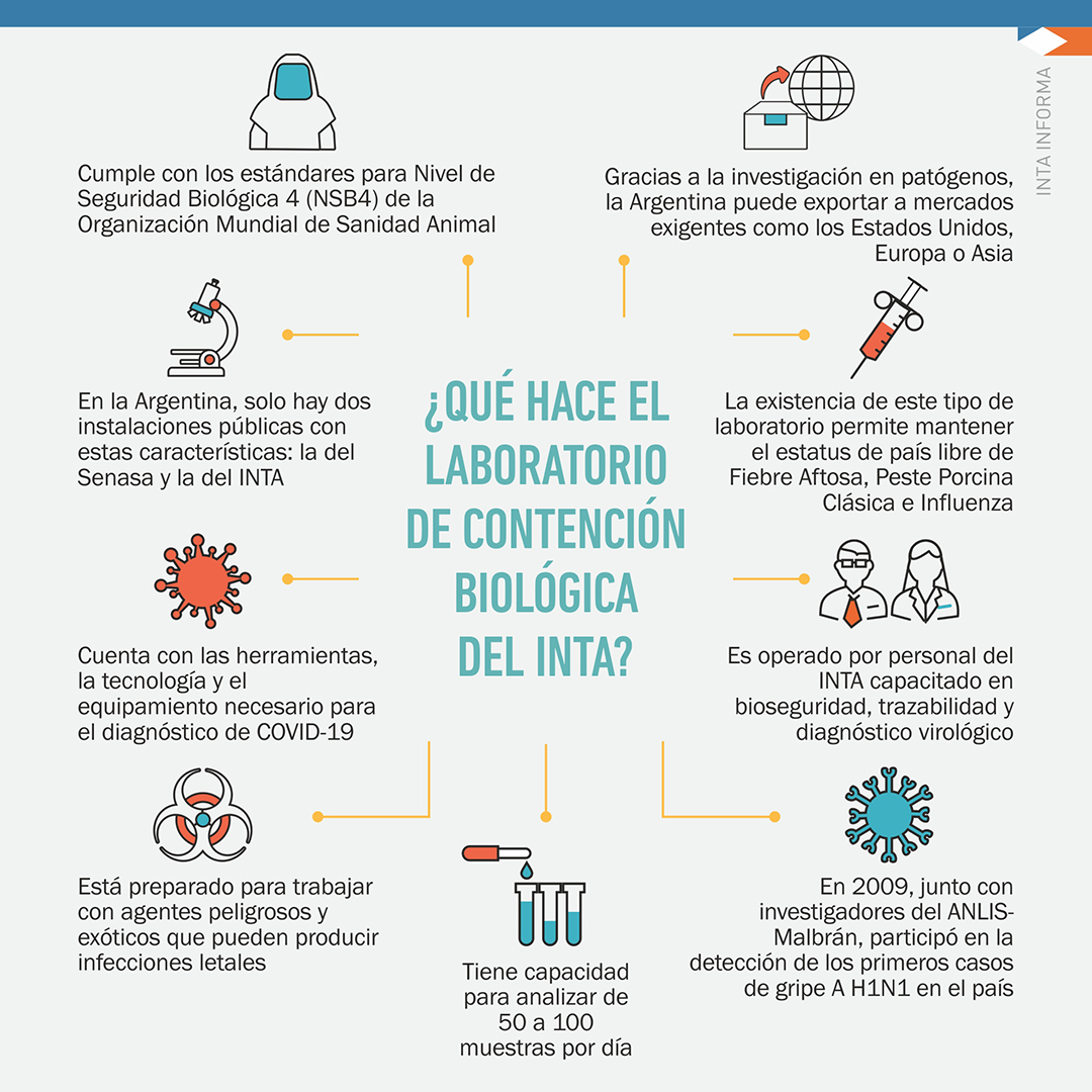 Localizado en Centro Nacional de Investigaciones Agropecuarias –CNIA– del INTA, el Laboratorio de Contención Biológica que posee el Instituto de Virología del INTA cumple con los estándares internacionales para Nivel de Seguridad Biológica 4 (NSB4) de la Organización Mundial de Sanidad Animal (OIE, por sus siglas en inglés) –el máximo en su tipo en el área veterinaria– y se encuentra habilitado –bajo normas nacionales– por la Comisión Nacional de Bioseguridad del Senasa. Por esto, es uno de los convocados por el Ministerio de Salud de la provincia de Buenos Aires para colaborar en el diagnóstico de COVID-19.