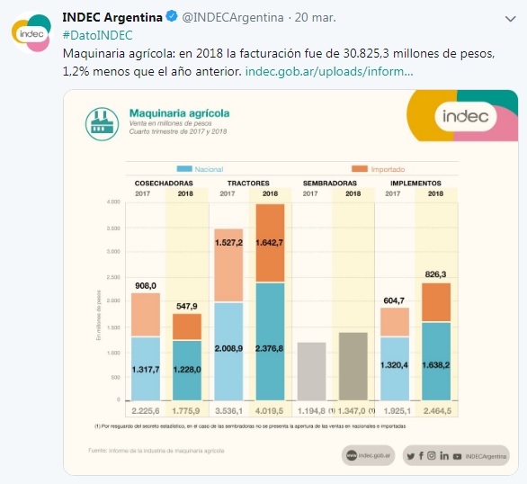 El Instituto De Estadísticas y Censos (INDEC) no para de informar con malas nuevas lo que ocurre en el escenario de la economía del país. El año 2018 cerró con una abrupta caída de la venta de maquinaria agrícola por la pérdida del poder de compra del productor argentino. Al aumento de desocupación y la caída del PBI se suma esta nueva cifra catástrofe.
