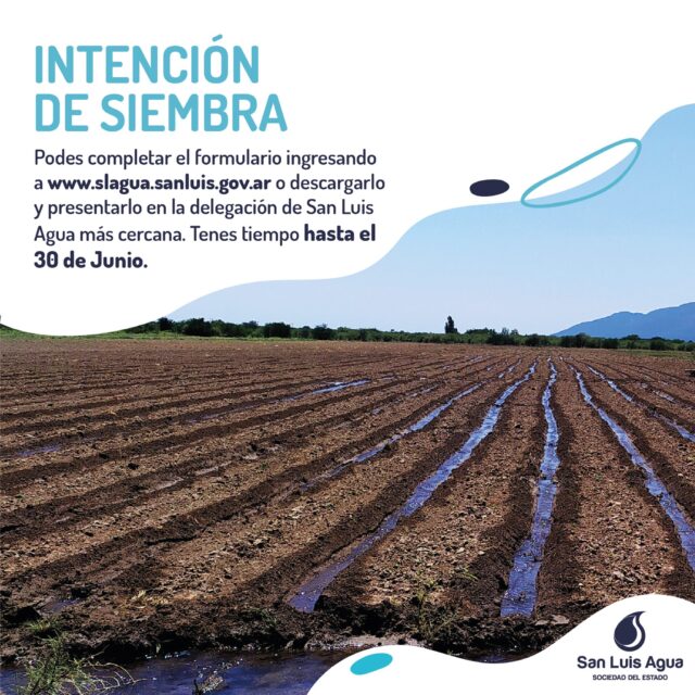 Con el propósito de continuar realizando una buena gestión del agua cruda, San Luis Agua informa a los usuarios que todavía tienen tiempo de realizar las intenciones de siembra, donde se detallan el tipo de cultivos y la cantidad de hectáreas donde se realizará, para poder realizar el cálculo hídrico requerido.
