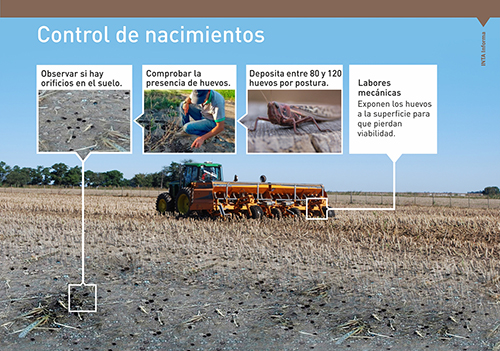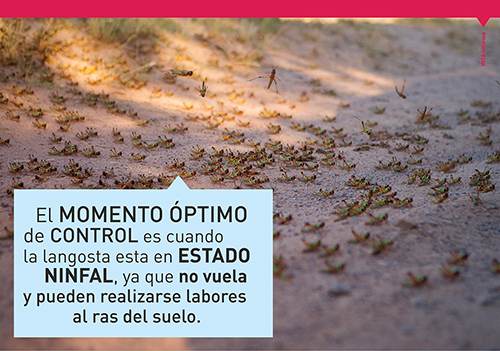 Las langostas en estado de ninfas no tienen capacidad de vuelo, por lo que el monitoreo es al ras del suelo. “Se deben observar periódicamente los sitios de posturas para verificar nacimientos y los daños en malezas o cultivos”, manifestó Medina.