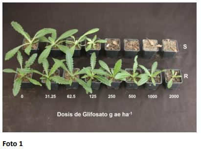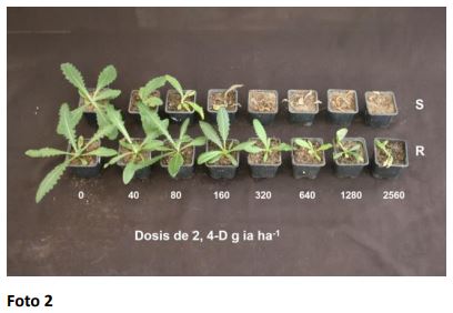 Los ensayos de laboratorio demostraron que las dosis necesarias para que la población resistente a glifosato (foto 1) y 2,4-D (foto 2) reduzca el peso fresco en un 50% fue de 4,6 y 6,8 veces superior, respectivamente, a la población susceptible.