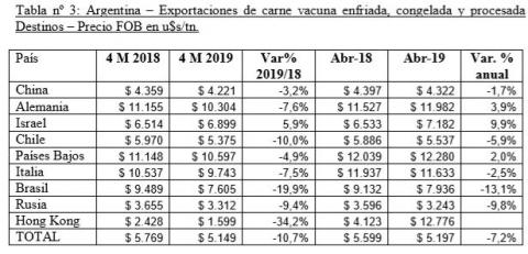 La República Popular China resultó el principal destino, en volumen, para la carne vacuna argentina durante los primeros cuatro meses del año 2019 con aproximadamente 93 mil toneladas, seguido por Chile, 9,4 mil toneladas, y luego por Israel, 9,1 mil toneladas. En cuanto al valor de las divisas ingresadas, el principal mercado durante el periodo ha sido China, que representa un (56,7%) del valor total exportado de carne vacuna enfriada, congelada y procesada en el periodo, seguido por Alemania (10,7%), e Israel (9,1%).