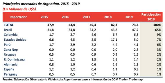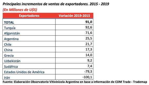 El Observatorio Vitivinícola Argentino, unidad ejecutora de la Corporación Vitivinícola Argentina (COVIAR) y gestionado por la Bolsa de Comercio de Mendoza, dio a conocer nuevos datos sobre las exportaciones argentinas de pasas de uva. Entre ellos se destaca que el país ha sido el tercero con el mayor crecimiento de las exportaciones de este producto, con una expansión de U$S25,5 millones entre 2015 y 2019. Solo es superado por Turquía (el principal exportador a nivel mundial) con U$S92,6 millones y Afganistán con U$S71,6 millones en el mismo periodo.