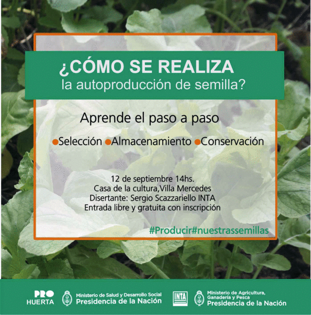 El INTA en su convocatoria expresa que para mejorar nuestra alimentación “debemos dar continuidad al fruto de nuestra huerta”. En el afiche se formula la pregunta ¿Cómo se hace la autoproducción de semillas? E invita a los interesados a aprender paso a paso la selección, el almacenamiento y la conservación.