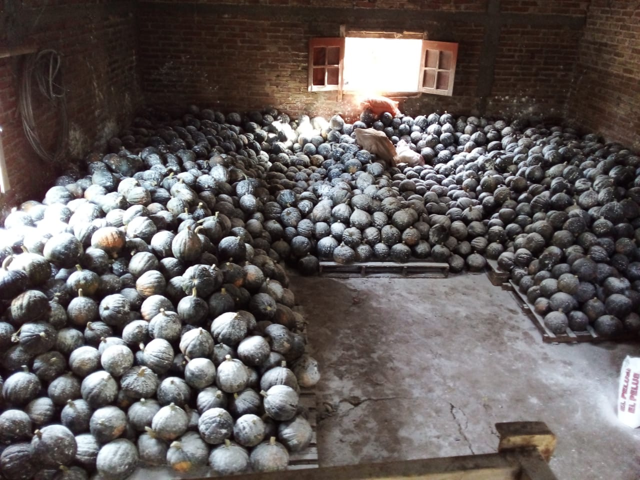 Tenían sembrado ¾ de hectárea, de la que calculan que han cosechado unos 12 mil kilos de zapallo. El fuerte de la plantación es el zapallo inglés. Aunque lo ha mezclado con el coquena y el anco, dado que necesita de éstos para la polinización. En un galpón los tienen almacenado. Forman una montaña de zapallos.