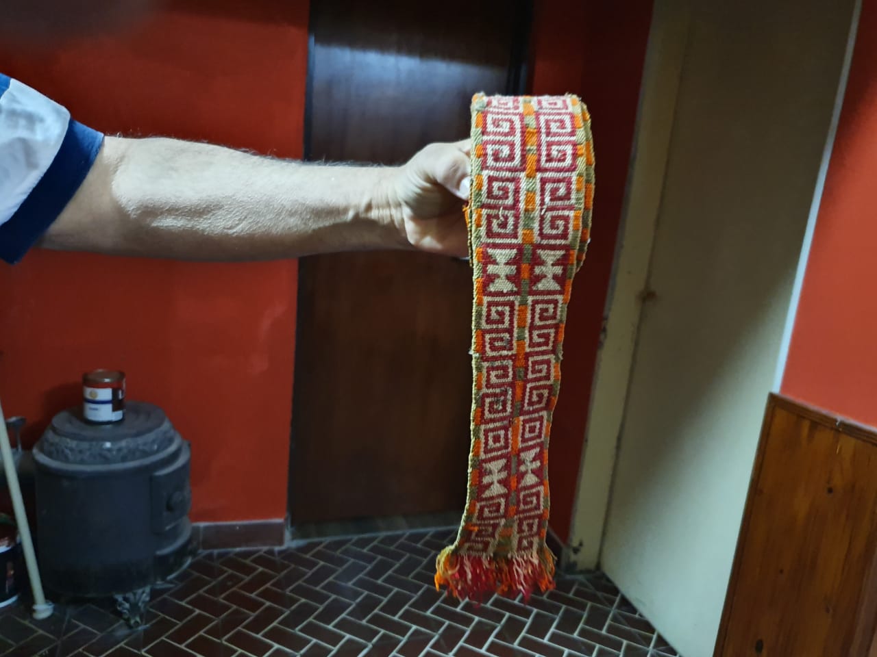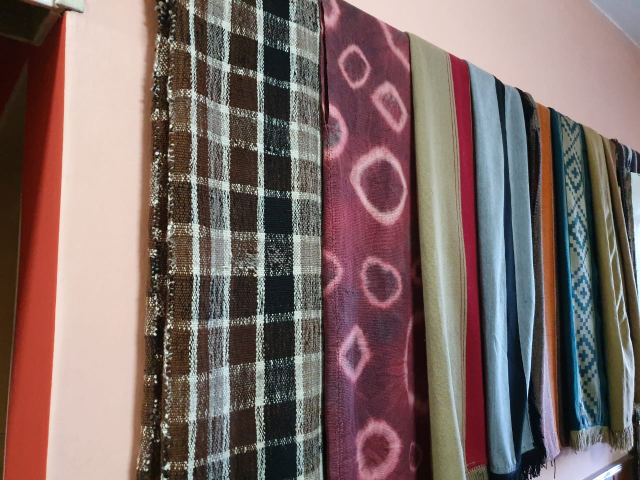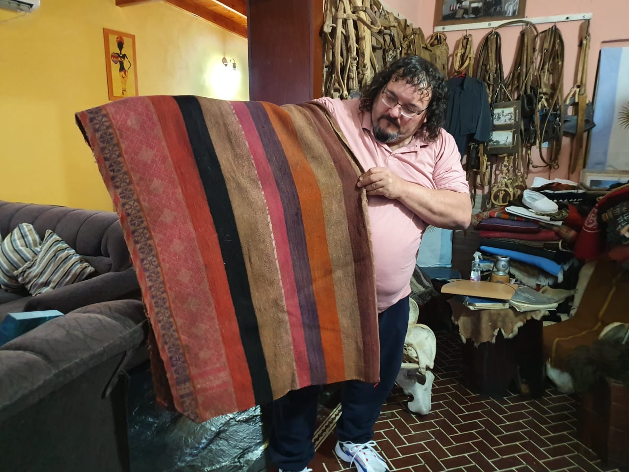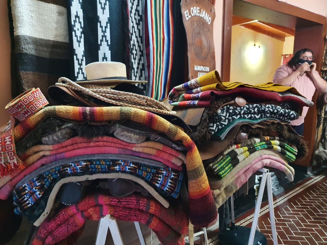 Sobre otra pared cuelgan prolijos los vistosos y variados ponchos que integran la cuidada colección de Jorge.