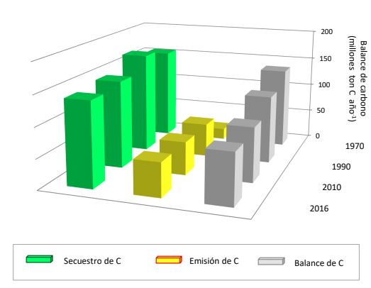 A continuación se puede ver el detalle del balance de carbono en el sector rural de Argentina en 1970, 1990, 2010 y 2016 según el método de cálculo que contempla secuestro de carbono en bosques y en tierras de pastoreo: