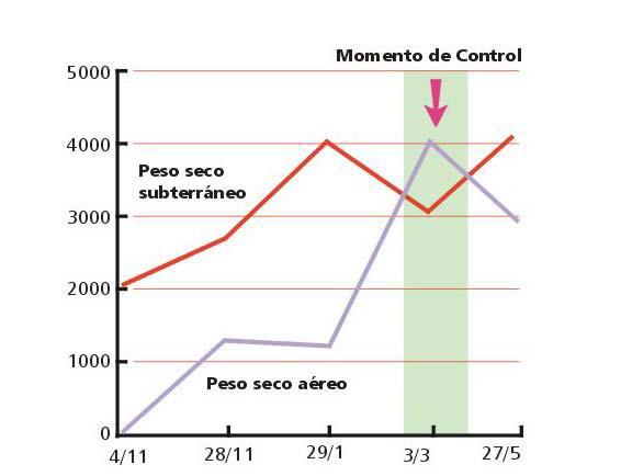 Figura 1. Peso seco (en kg/ha) de la parte aérea (línea violeta) y parte subterránea (línea roja) del gramón en función del tiempo (en días), a partir del inicio de la brotación. La flecha indica la oportunidad de aplicación de un control efectivo del gramón. Fuente: Cepeda S.A. y A.R. Rossi, EEA INTA Pergamino.