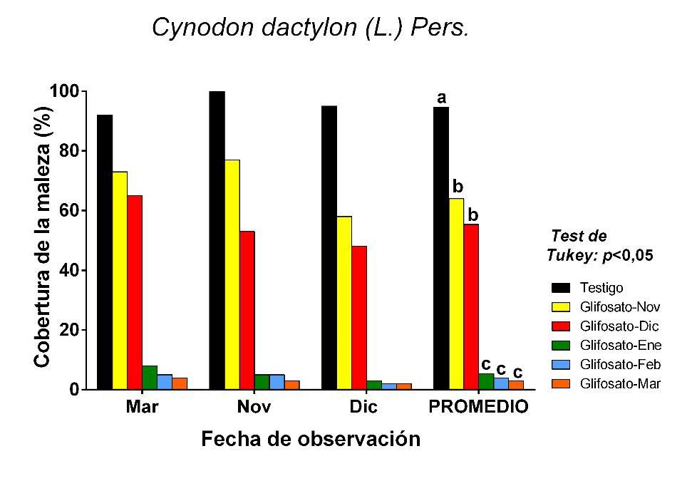 Independientemente de la fecha de aplicación, el control químico siempre redujo los niveles de cobertura del gramón (Fig. 2). En promedio, los controles químicos realizados durante los meses de noviembre y diciembre mostraron valores de cobertura significativamente mayores (~60%) que aquellos efectuados durante enero, febrero y marzo (~5%) (Fig. 2). Para la mayoría de los tratamientos con control químico, la cobertura del gramón tendió a reducirse levemente a medida que transcurrió el tiempo de observación.