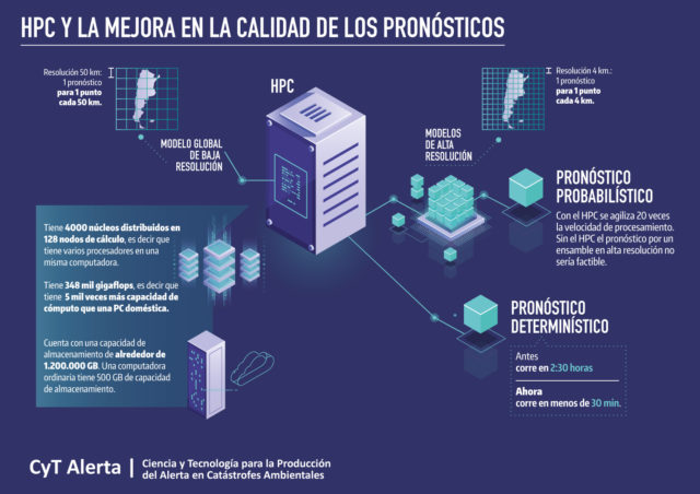 A partir de este proyecto, con una inversión de 133 millones de pesos, Argentina tiene ahora el equipo de Cómputo de Alto Rendimiento más grande de los servicios meteorológicos de Sudamérica, que multiplica 20 veces la capacidad de procesamiento de modelos numéricos de pronóstico y posibilita el desarrollo de pronósticos probabilísticos, para mejorar y fortalecer el sistema de alerta temprana.