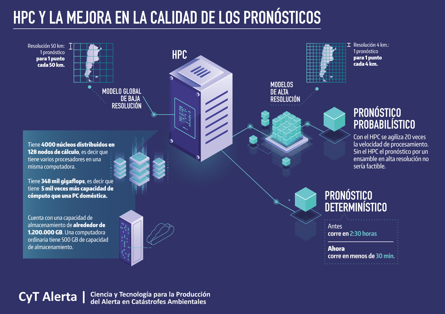 CIMA. En el marco del CyT alerta, el CIMA adquirió una computadora que cuenta con 480 núcleos de procesamiento y representa un aumento del 330% en la capacidad de cómputo del instituto. Este equipo se utiliza para potenciar la investigación en temas directamente vinculados con los objetivos del CyT Alerta, como avanzar en el entendimiento de los mecanismos que producen los eventos meteorológicos extremos y en el desarrollo de tecnologías que permitan hacer un uso eficiente de las nuevas redes de observación desplegadas en los últimos años (radares meteorológicos, nuevos satélites meteorológicos, entre otros).