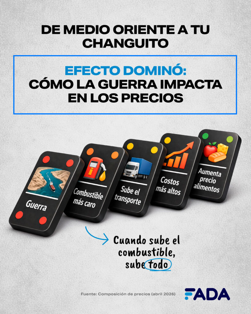 También consumimos 7% más de lácteos, puede deberse a que el aumento en el último año fue del 13%, por debajo de la inflación. La guerra en Medio 0riente empieza a impactar en las góndolas. Actualmente, los costos son: el 51% del precio de la carne, el 61% del pan y el 71% de la leche y podrían pesar más por el aumento del combustible y la urea que se utiliza para los cultivos. “Lo que pasa en Medio Oriente afecta nuestros bolsillos: en el actual contexto de guerra, el primer costo que va a subir es el de los fletes, principalmente por el aumento en los combustibles debido al bloqueo del estrecho de Ormuz.
