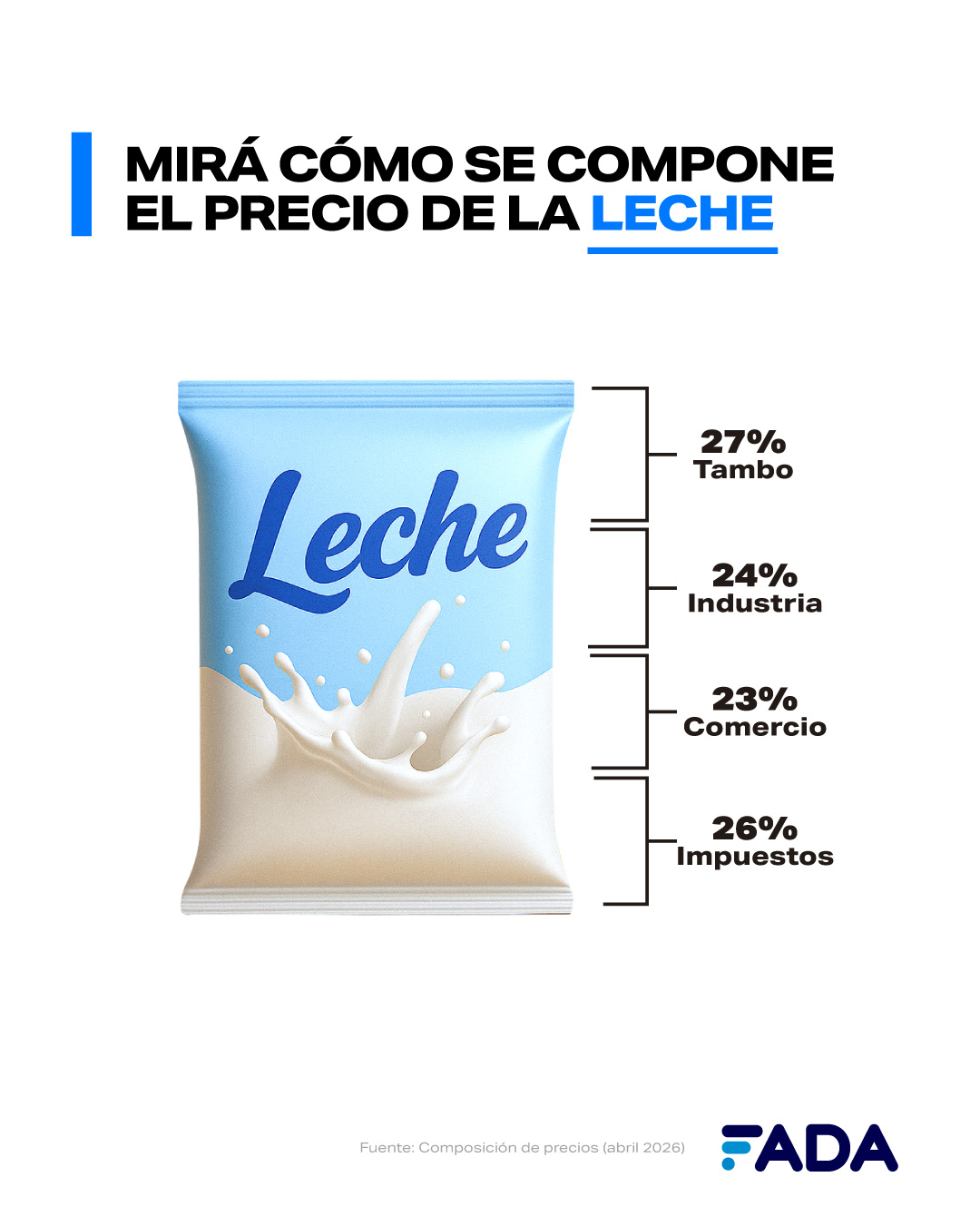 En la leche 71% son costos, 26% son impuestos y sólo un 3% son ganancias. Del valor que pagamos al comprar un sachet, el tambo es el 27%, 24% la industria, 23% el comercio y 26% los impuestos.