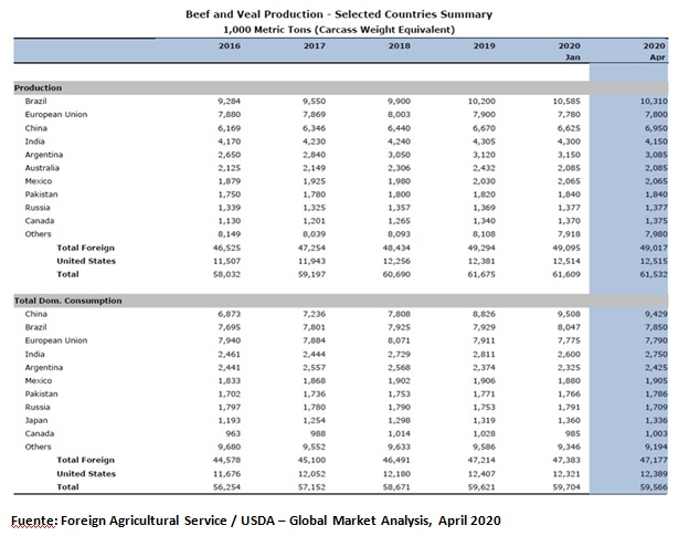 De acuerdo al Departamento de Agricultura de los Estados Unidos (USDA), la producción mundial de carne vacuna se mantendría prácticamente sin cambios durante el año 2020.