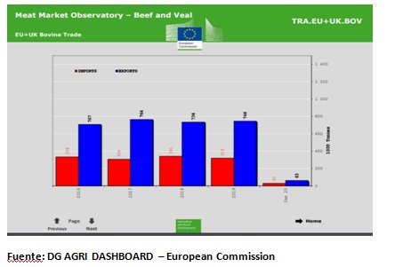De acuerdo a los datos del DG AGRI DASHBORAD las importaciones de carne de la Unión Europea (EU+UK) han oscilado durante los últimos 4 años en volúmenes que se han ubicado entre 300 mil y 340 mil ton en tanto que sus exportaciones representan prácticamente el doble, con volúmenes que han oscilado entre 700 mil y 760 mil ton.