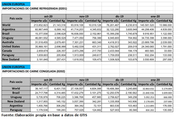 Mercosur continúa siendo el principal proveedor de carne a la Unión Europa, representando sus ventas el 78% de las importaciones extracomunitarias de la misma. Brasil es el principal proveedor con el 40% en 2019, seguido por la Argentina, con el 22,5%, y Uruguay con el 13.8 %.