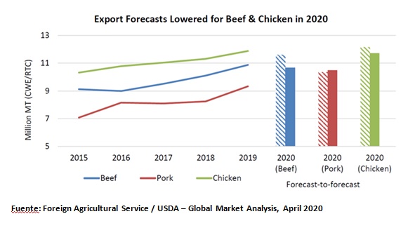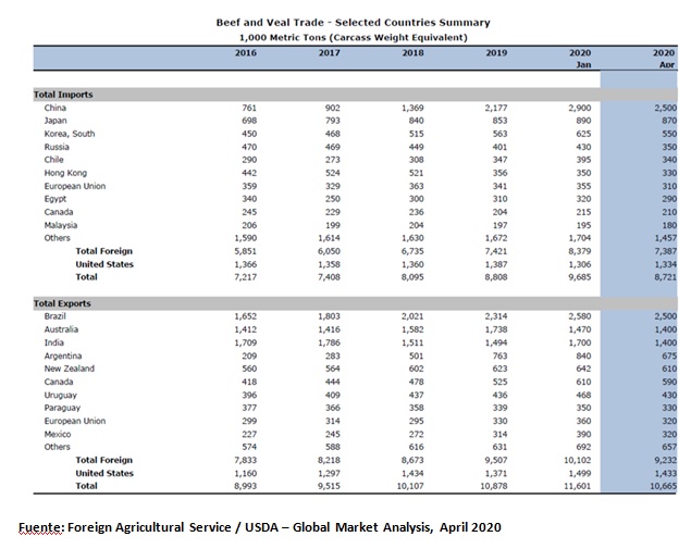 En su informe de abril 2020, el USDA corrigió a la baja sus proyecciones para el comercio internacional de carne vacuna. En enero 2020 el USDA estimaba un crecimiento del 10% en las importaciones de carne de los principales mercados, impulsadas principalmente por China (+33 %).Sin embargo, en su informe de abril, el USDA proyectó una desaceleración, ubicando las importaciones de los principales 10 compradores de carne por debajo de sus compras de 2019, mostrando una baja de casi el 1%.
