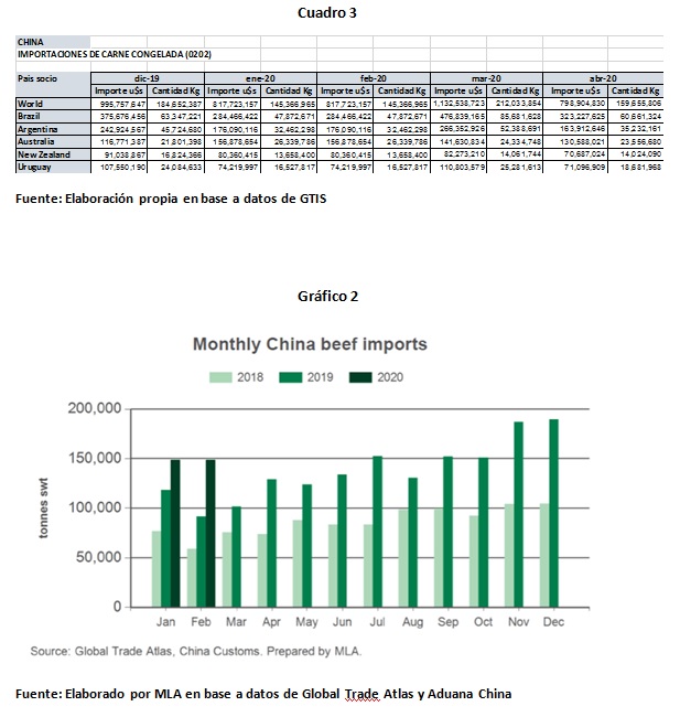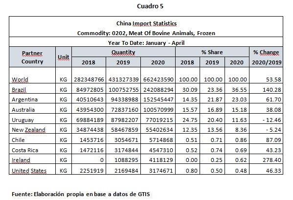 El Cuadro 3 muestra la evolución de las importaciones de carne vacuna congelada de China de los últimos 5 meses (recordamos que las importaciones de carne congelada superan 99% de las importaciones totales de carne de China).