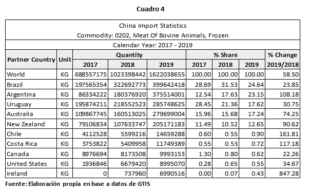 Con respecto a los principales proveedores de carne, Mercosur continúan siendo el principal proveedor de carne a China. En 2019 Brasil cubrió el 24.6% de las importaciones de China, Argentina el 23.1 % y Uruguay el 17.6 %, en tanto que Australia logró en 2019 incrementar sus ventas en un 74 % alcanzando una participación de mercado del 17.2 %(Cuadro 4)
