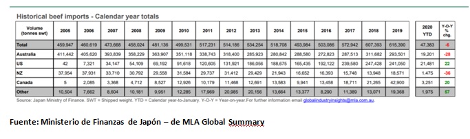 Los principales proveedores de carne para Japón son Australia y Estados Unidos, tanto para carne refrigerada como para carne congelada.