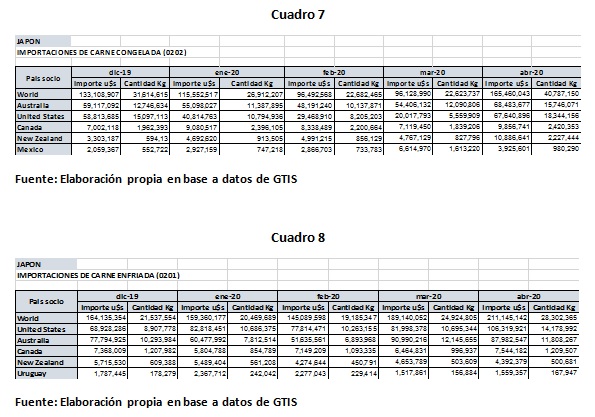 Como puede observarse en los Cuadros 7 y 8, a diferencia de China, Japón tiene una composición más diversificada de sus importaciones respecto a China, con el 59 % de sus importaciones correspondientes a carne congelada y 41 % a carne refrigerada con precios promedio de importación (abril 2020) de U$S 4.057/tn para carne congelada y U$S 7.460/tn para carne refrigerada.