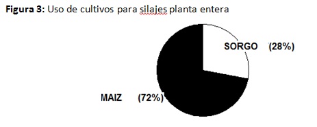 Los encuestados coinciden con la realización habitual de reservas forrajeras, solo un 5% es reciente en la adopción de la tecnología (<3 años de experiencia), lo que significa que constituye un elemento estructural del establecimiento. En términos generales, la mayor proporción corresponde a silajes de maíz (Fig.3), encontrando mayor porcentaje de silo de sorgo en la zona II y con tendencia ascendente a silajes de sorgo del tipo azucarado para la obtención de fibra, que se suplementa con proteína y grano en las TMR de terminación. No se observaron silajes de alfalfa, ni verdeos de invierno.