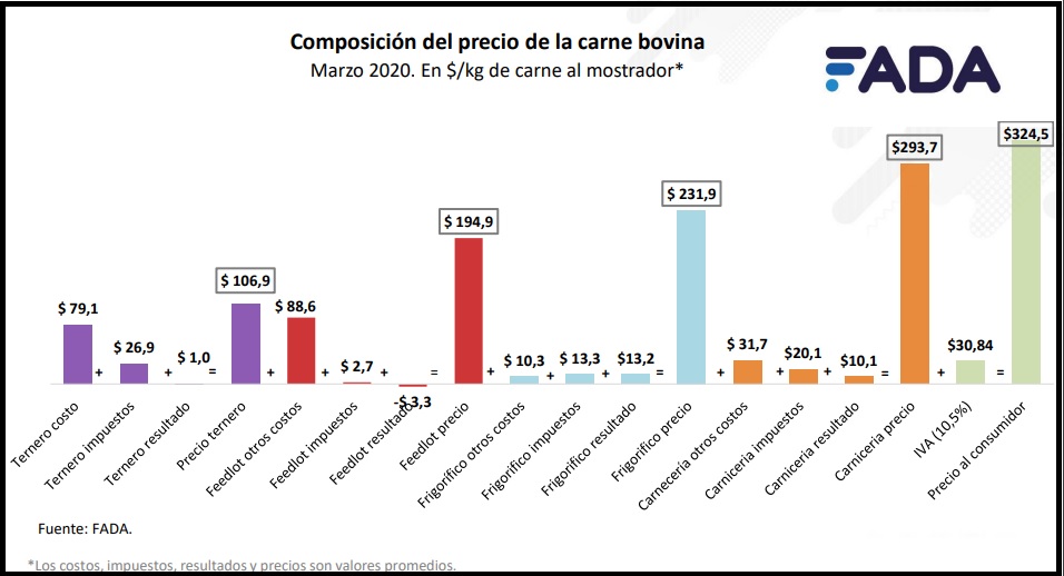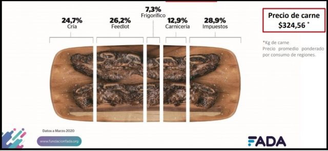 El informe de FADA demuestra que, la carne en marzo tuvo un precio promedio de $324,56 por kilogramo, de ese precio el ternero representa el 24,7% ($80,06), el feedlot el 26,6% ($85,30), el frigorífico el 7,3% ($23,62), la carnicería el 12,9% ($41,79) y los impuestos el 28,9% ($93,79).