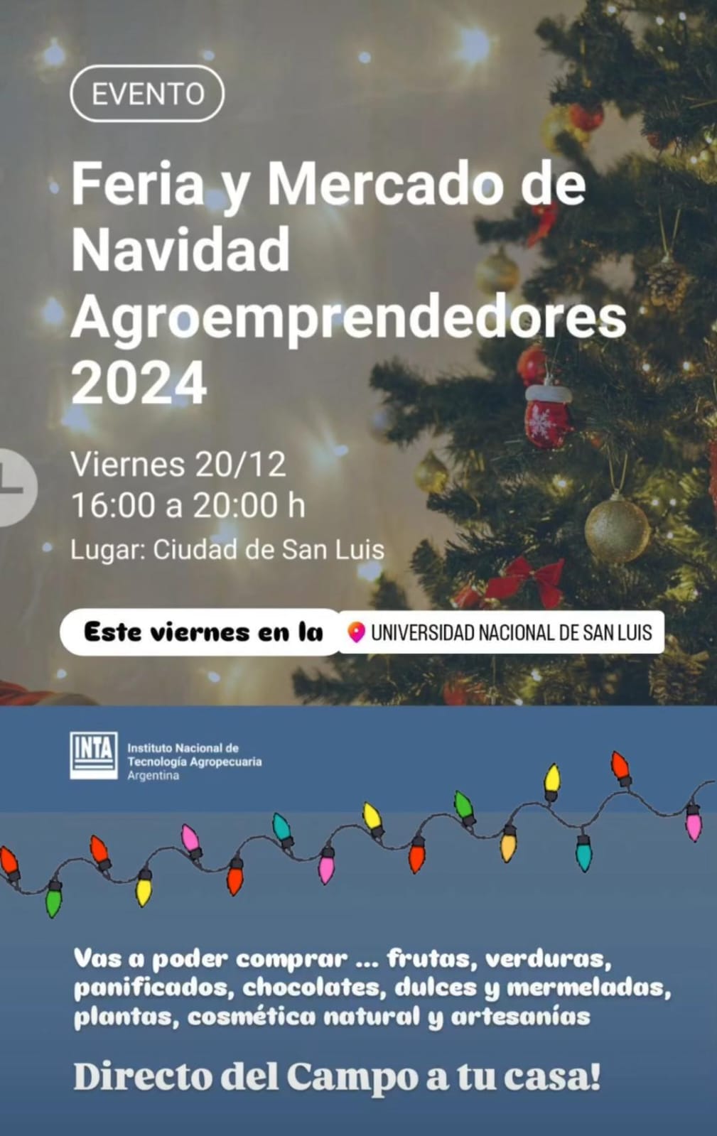 Emprendimientos de base agropecuaria de los departamentos Pedernera, Pueyrredón y Ayacucho ofrecerán sus productos en veinte puestos que se dispondrán en el rectorado de la Universidad Nacional de San Luis, donde este viernes de 16 a 20 se desarrollará la Feria y Mercado de Navidad, organizada por el INTA.