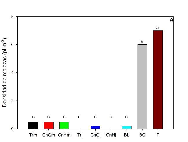 En el año 2013 se comparó el efecto de trigo y centeno como cultivos cobertura en la aparición de malezas en Villa Mercedes (Figura 1). Ambas especies controlaron la aparición de malezas durante el periodo entre octubre y noviembre con una reducción del 98% en centeno y el 91% en trigo con respecto a una situación sin control químico ni cultivo de cobertura. En el año 2015 en Buena Esperanza se evaluó el efecto de la interacción entre el material y la fecha de siembra de los CC en la emergencia de malezas frente a otras estrategias de manejo basadas en un control químico a partir de agosto (barbecho BL, largo), a partir de octubre (BC, barbecho corto); además de un testigo sin control ni CC (Figura 2a). Los mayores controles se efectuaron con los cultivos de cobertura y el barbecho largo, sin diferencias entre materiales, ni efecto de la fecha de siembra.