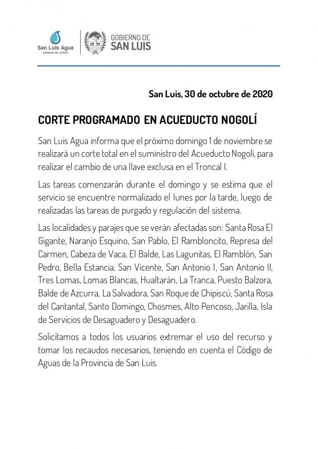 San Luis Agua informó que se realizará el cambio de una llave exclusa en el Troncal I. El servicio se verá interrumpido desde el domingo por la tarde por un lapso de 36 horas.