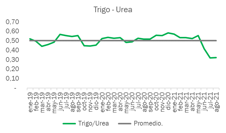 Algo relevante a tener en cuenta es que a pesar del incremento de los precios del trigo, la relación insumo – producto empeoró bastante si comparamos con las campañas de los últimos años. Los gastos para esta campaña fueron mayores para los productores y por eso es necesario saber bien cuál será nuestro rinde de indiferencia. Si miramos la relación I-P del Trigo disponible versus glifosato y urea, vemos que se ubica en la peor de los últimos 3 años.
