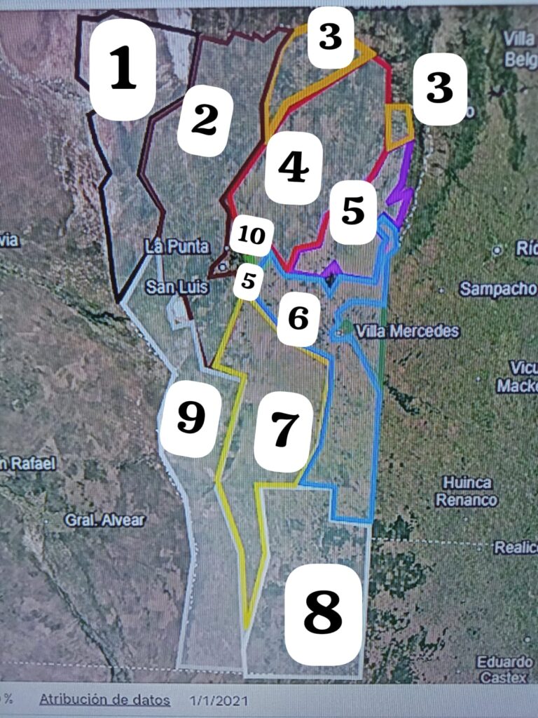 1 zona de cría, 50 a 300 US$; 2 zona de cría con potencial de mejoras, 300 a 500 US$; 3 campos de riego, 5000 US$; 4 zona serrana de cría, 400 a 500 US$; 5 zona La Toma a Concarán y ruta 1, 200 a 1800 US$; 6 zona Fraga a Villa Mercedes, 1500 a 3000 US$; El triángulo de las rutas nacionales 7 y 8, 1500 a 3500 US$; 7 zona, 500 a 1500 US$; 8 zona, 500 a 700 US$; 9 zona, de 150 a 500 US$, y 10 zona, El Durazno, 6000 US$.