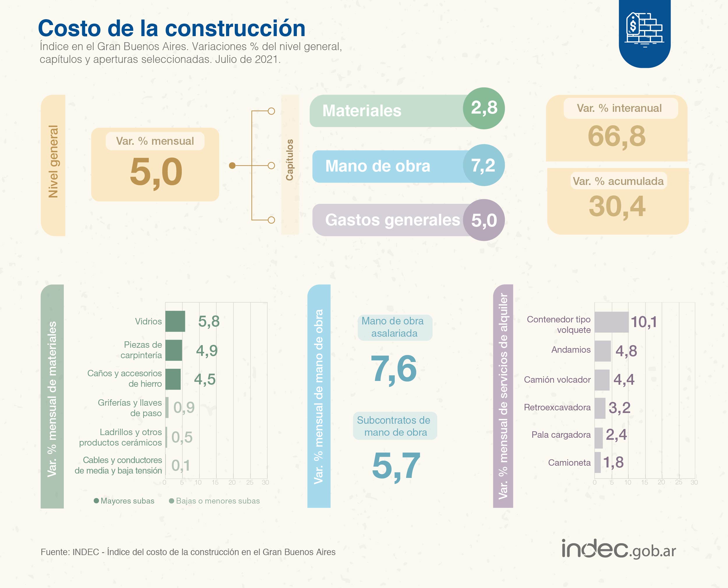 El costo de la construcción pegó un salto fuerte en julio pero no causa demasiadas alarmas, ya que era esperado y se basó en las paritarias. La suba promedio fue de 5%, pero los materiales treparon “solo” 2,8% y eso implicó una nueva desaceleración, esta vez de 0,8 punto, tal como había ocurrido en junio. La mano de obra aumentó 7,2% y los gastos generales 5%.