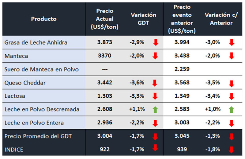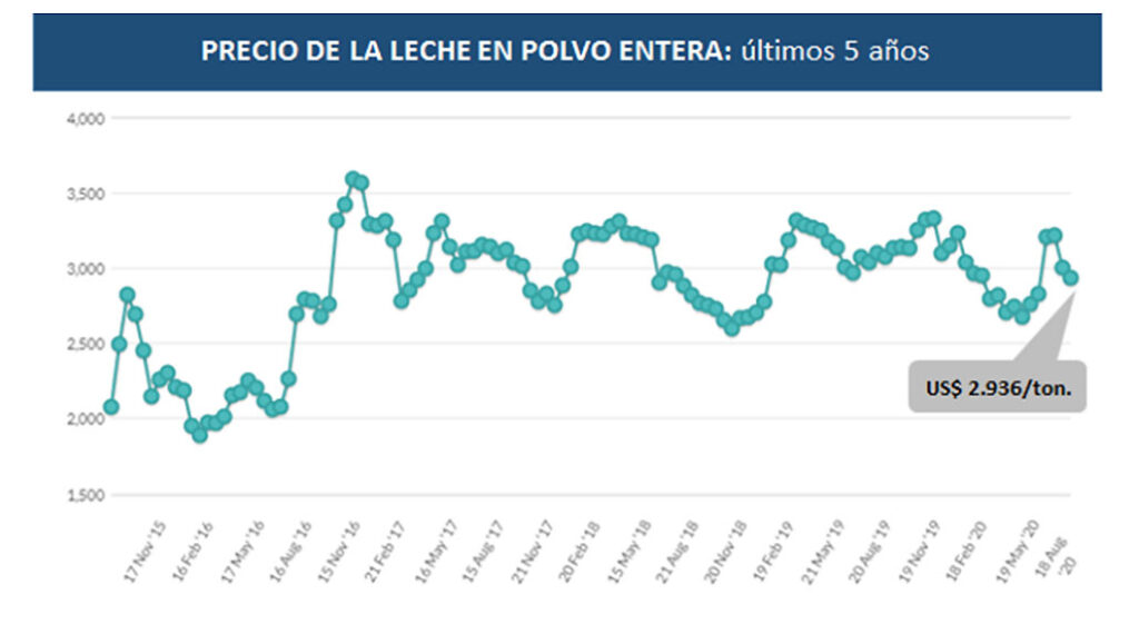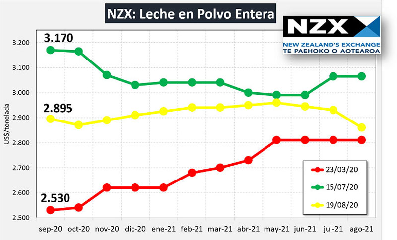 Luego de la subasta del Global Dairy Trade del 18 de agosto donde la leche en polvo entera cayó un 2,2% en su cotización, alcanzando el valor de US$ 2.936/toneladas, el Mercado de Futuros experimentó para el mes de septiembre próximo una baja del 1,9%, llegando a 2.895 por tonelada.