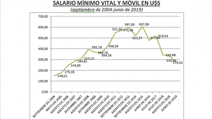 El Salario, Mínimo, Vital y Móvil (SMVyM) de junio de 2019 medido en dólares retrocedió 12 años y se mantiene en valores cercanos a agosto de 2007.