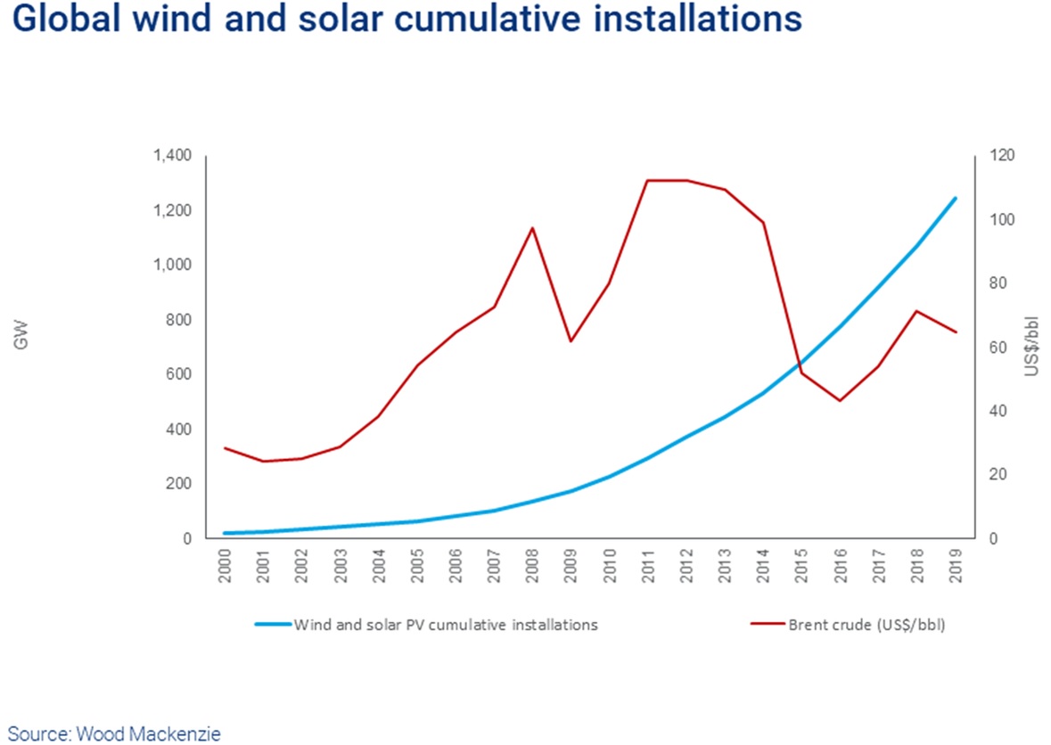 Históricamente, el precio del petróleo no ha mostrado ninguna correlación con la inversión en energías renovables. La instalación tanto de energía eólica como solar continuó aumentando durante la última caída del precio del petróleo.