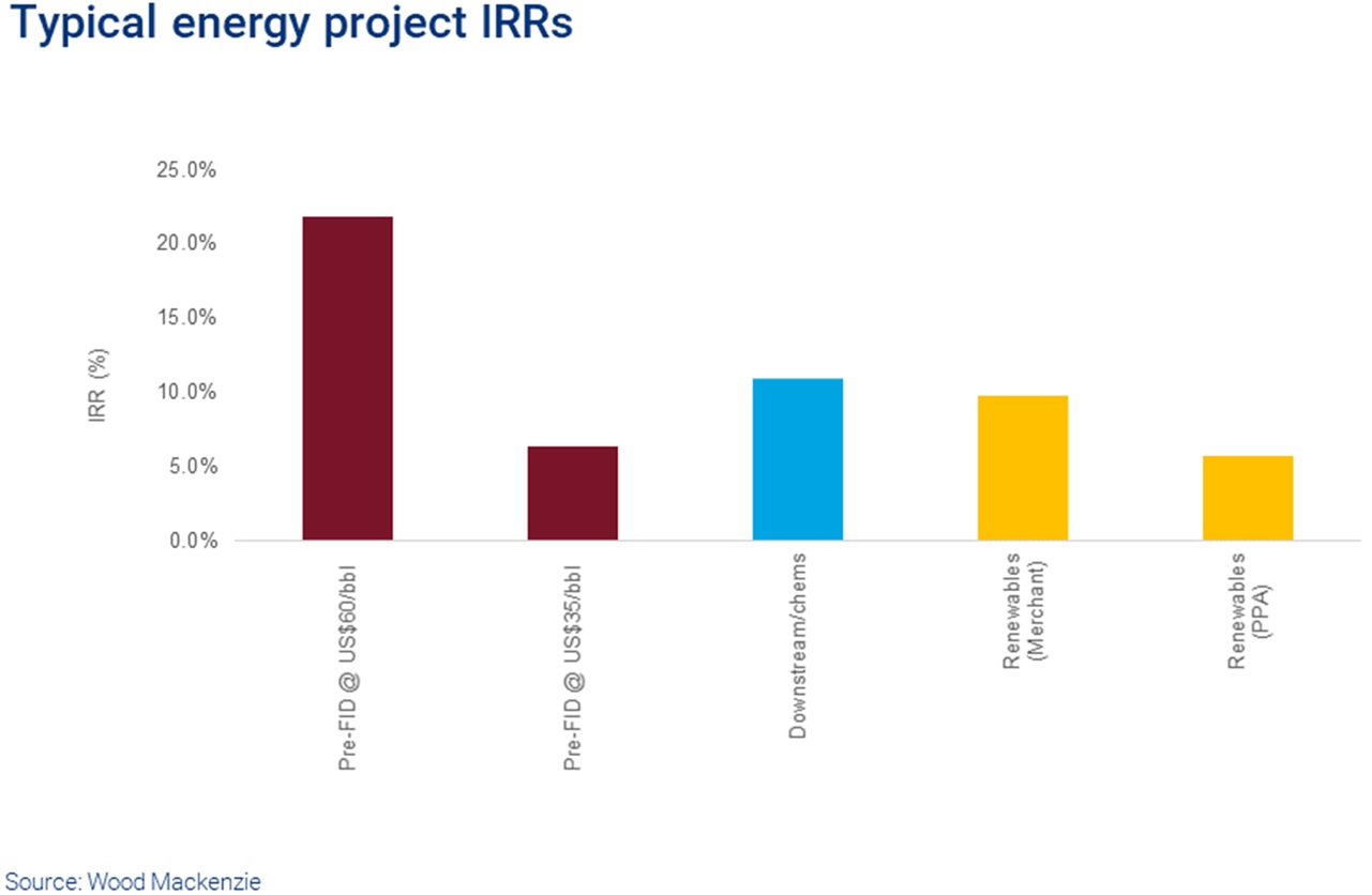 A 60 dólares por barril, los activos solares y eólicos, con un rendimiento medio de 5-10% de TIR, han tenido dificultades para competir con los rendimientos de dos dígitos esperados para el petróleo y el gas. Pero con el precio actual del petróleo, los rendimientos del petróleo y el gas están ahora en línea con lo que los inversores pueden esperar de los proyectos solares y eólicos de bajo riesgo.