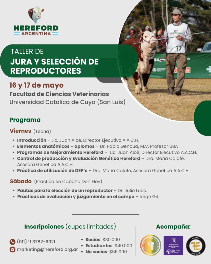 La capacitación se desarrollará el 16 y 17 de mayo próximos. El primer día, el doctor Pablo Genoud, profesor de la Universidad de Buenos Aires (UBA), hablará sobre elementos anatómicos y aplomos; le seguirá Juan Aloé, director Ejecutivo de la Asociación Argentina de Criadores de Hereford (AACH), quien expondrá sobre los programas de mejoramiento de la raza, y cerrará La doctora María Calafé, asesora genética de la AACH, sobre control de producción y evaluación genética Hereford y práctica de utilización de DEP’s.
