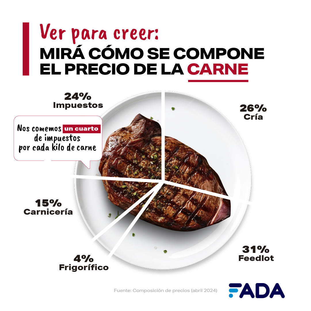 Del precio del kilo de carne, la cría representa el 26%, el feedlot 31%, frigorífico 4%, carnicería el 15% y los impuestos el 24%. Otra forma de expresarlo indica que impuestos representan el 24% del precio, el 60% son costos de la cadena y 16% ganancias.