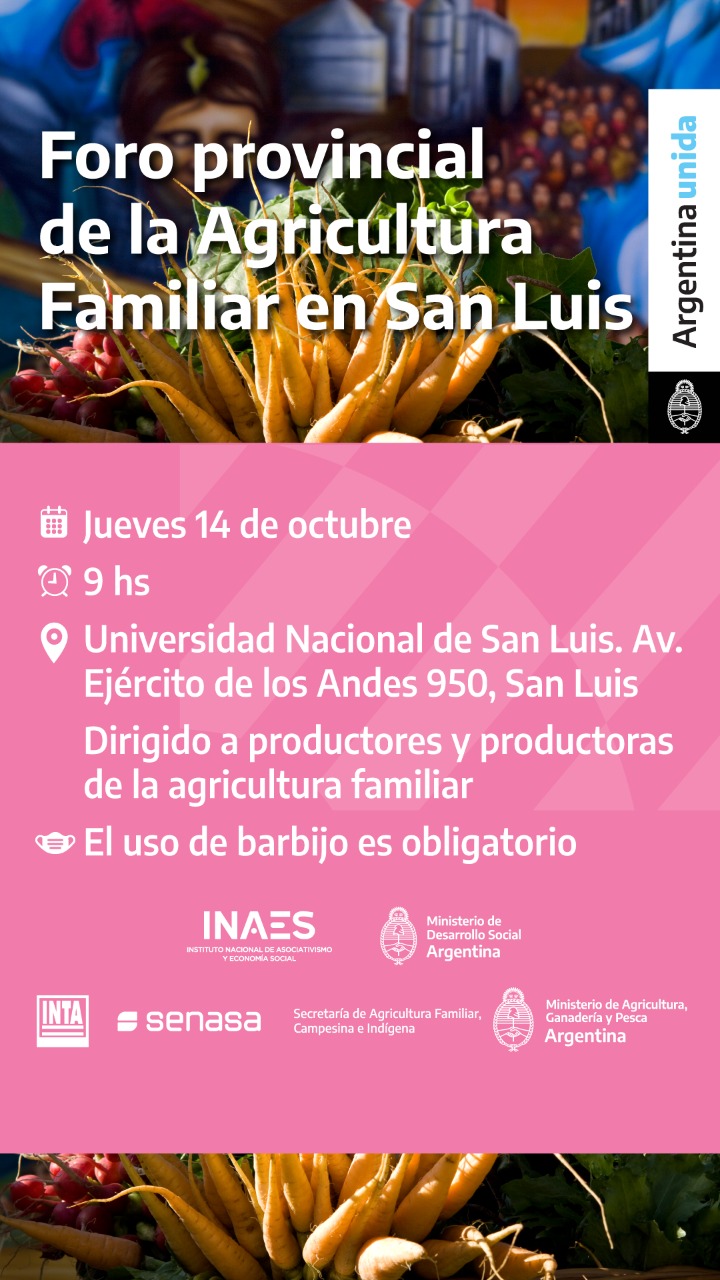 Productoras y productores de la agricultura familiar de la provincia de San Luis tendrán oportunidad para debatir su problemática durante el Foro que se realizará el próximo 14 de octubre en el auditorio Mauricio López de la Universidad Nacional de San Luis.