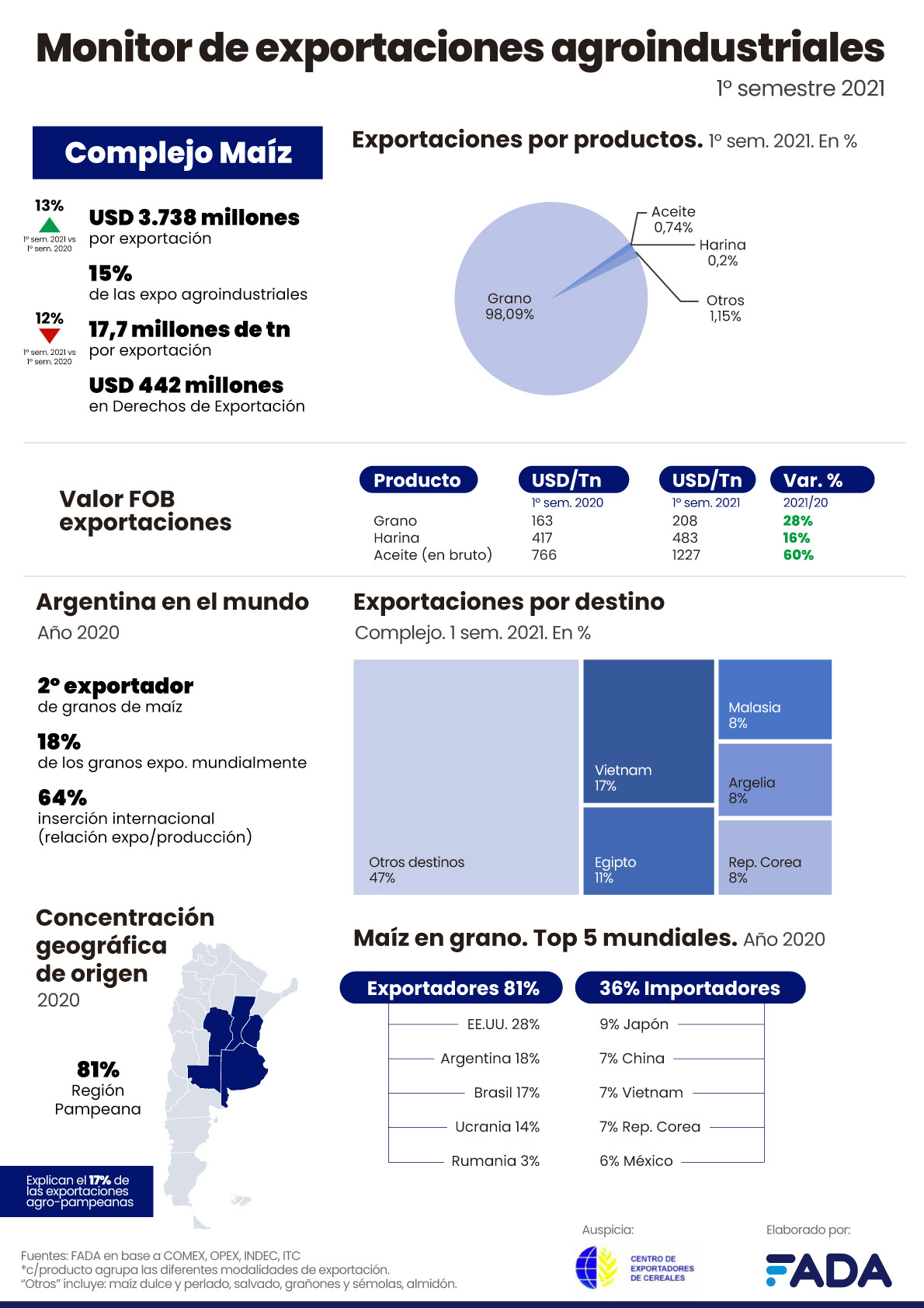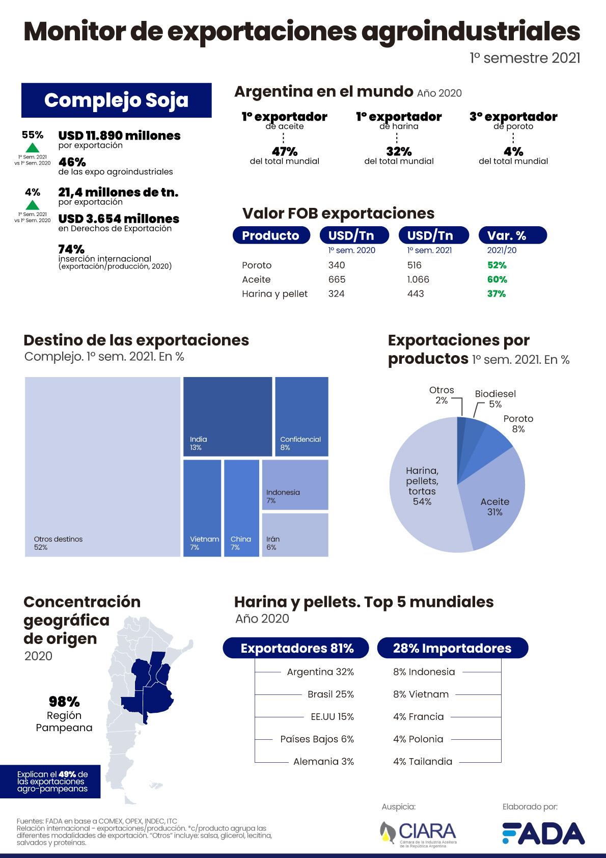 – Top 3 de mayores exportadores: complejo soja (46,4%), complejo maíz (14,6%) y trigo (7%).