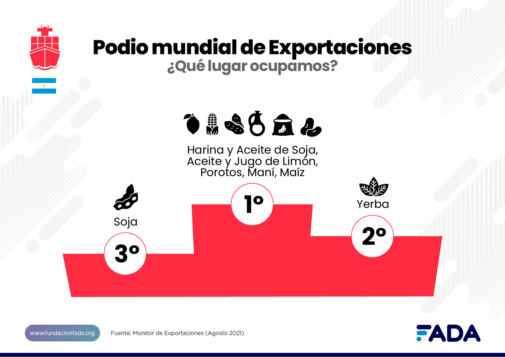 – Podio de posición argentina en el mercado mundial: 1º puesto como exportador de harina de soja, aceite de soja, porotos, aceite de limón, jugo de limón, maní, maíz. 2º exportador mundial de yerba. 3º exportador de soja. 4 º en peras y leche en polvo. 5º aceite de girasol, camarones y langostinos, lanas, harina de trigo y carne de vaca.
