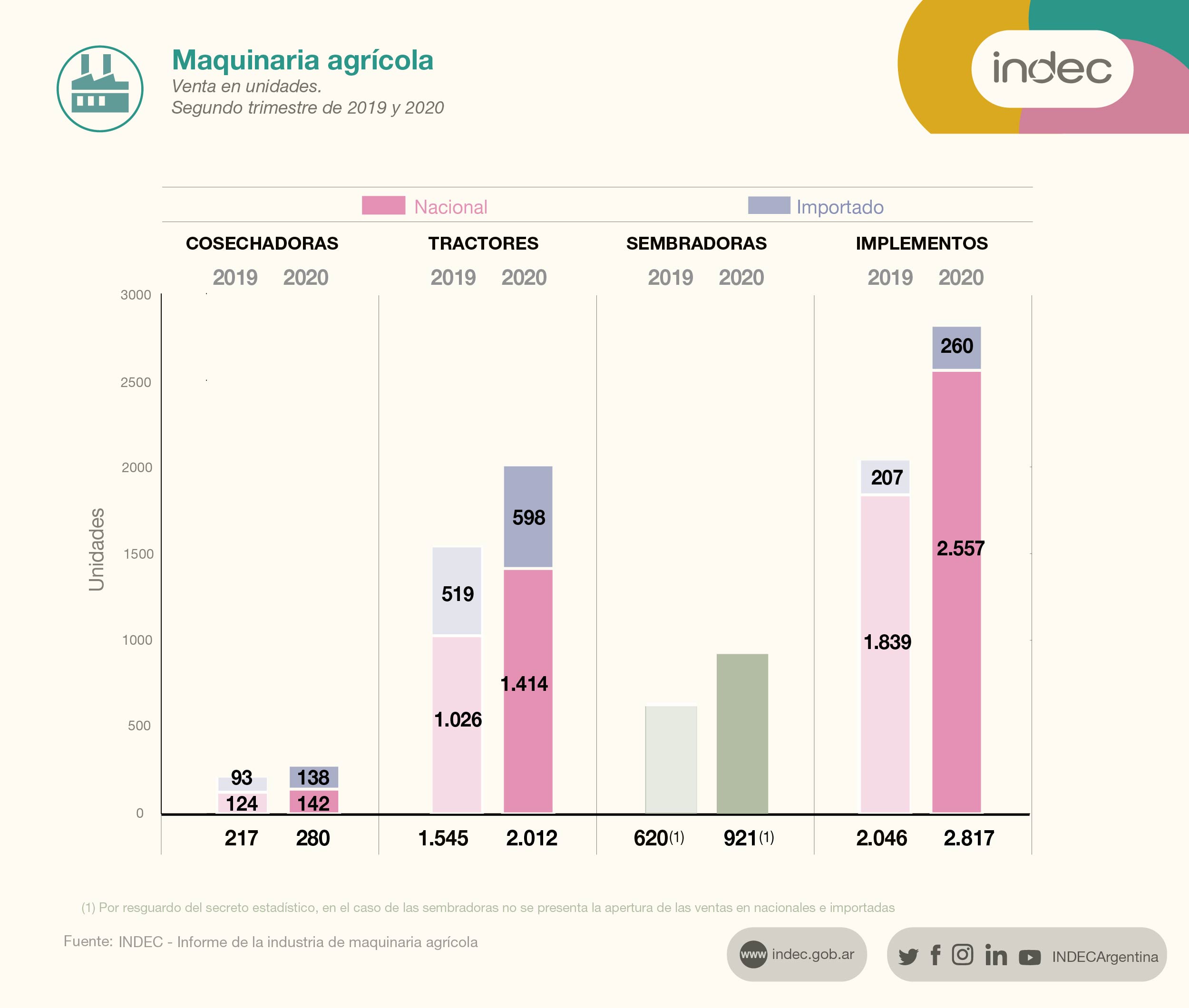 En el segundo trimestre de 2020, las unidades vendidas de todos los segmentos de maquinarias registraron un aumento respecto a igual trimestre del año anterior. Las sembradoras presentaron la mayor suba con 48,5%; los implementos aumentaron 37,7%; los tractores, 30,2% y las cosechadoras, 29,0%.