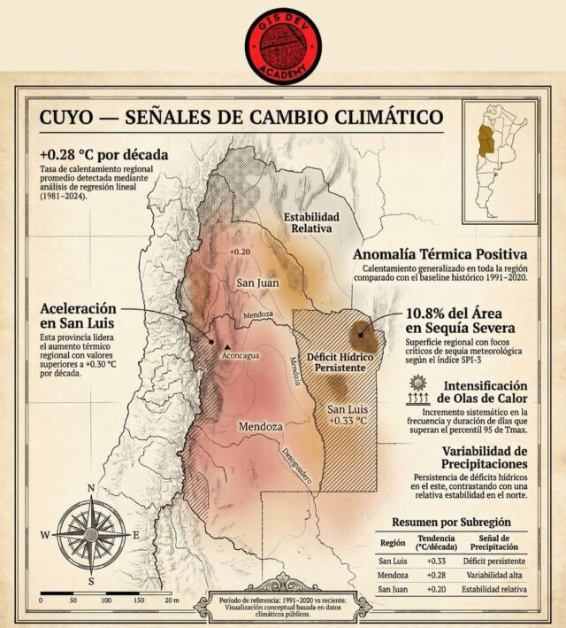 Según una visualización basada en datos climáticos difundida por la plataforma especializada GIS Dev Academy, la región de Cuyo registra un calentamiento promedio de +0,28 °C por década para el período 1981-2024. Sin embargo, el comportamiento no es uniforme entre provincias.